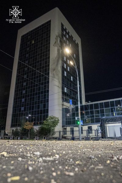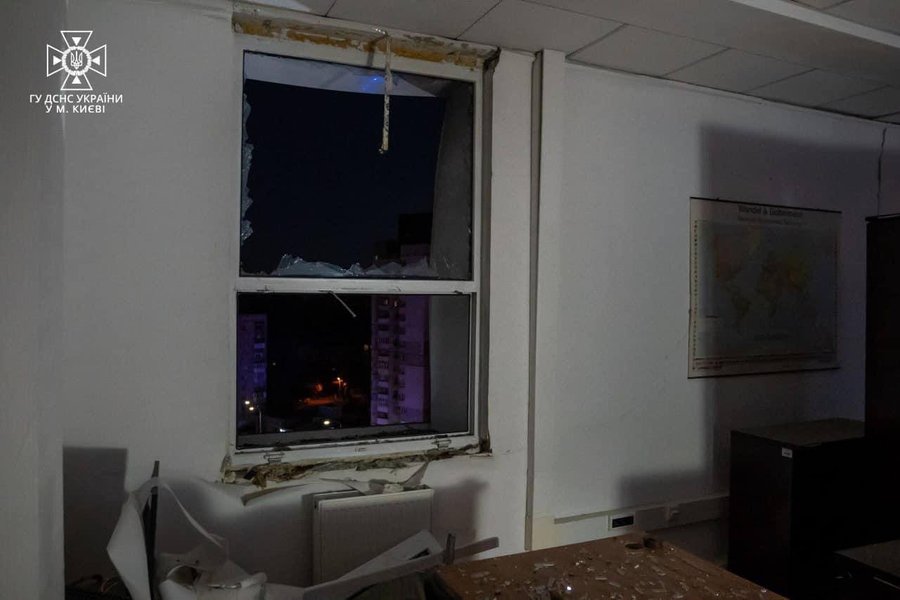 По информации Главного управления ГСЧС Украины в Киеве, в Соломенском районе был поврежден фасад административного здания с 9 по 11 этажи в результате падения обломков.