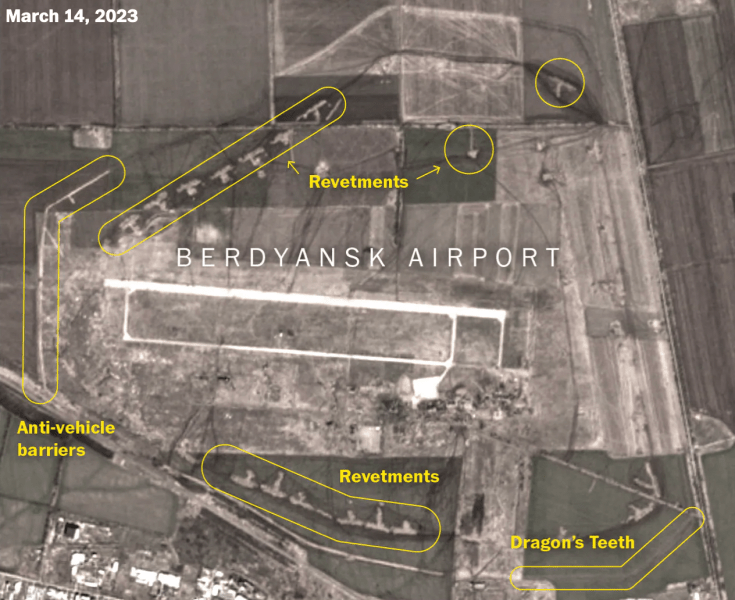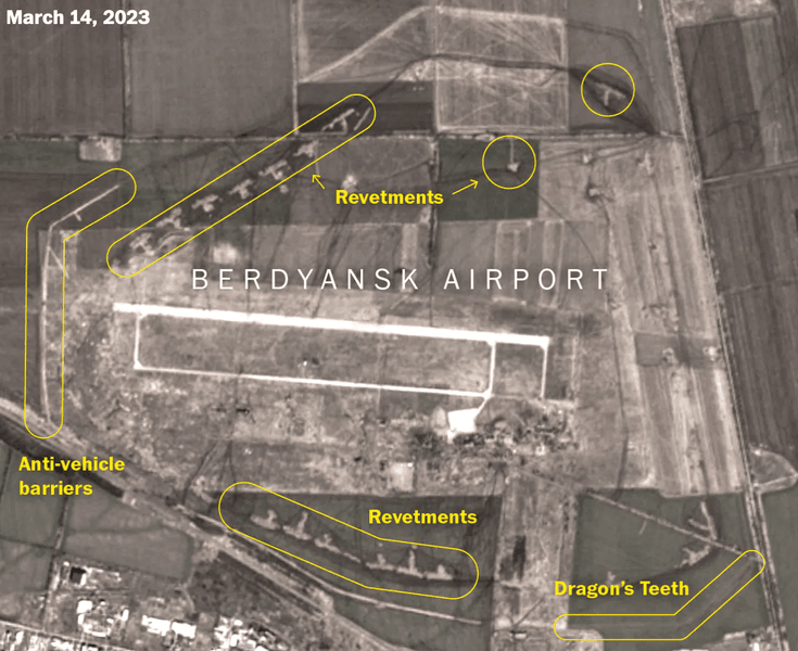 Спутниковые снимки указывают и на появление новых сооружений ВС РФ вокруг аэропорта в городе Бердянск в Запорожской области. Аналитик объяснил, что большие заграждения и траншеи призваны защитить базу для российских вертолетов, ведь те участвуют в операциях на юге Украины.