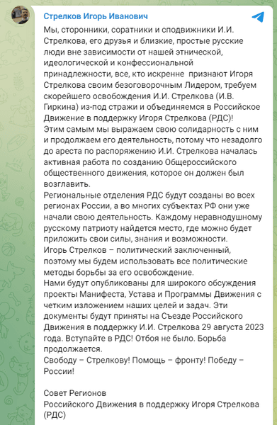 "Мы, сторонники, соратники и сподвижники И.И. Стрелкова, его друзья и близкие, простые русские люди вне зависимости от нашей этнической, идеологической и конфессиональной принадлежности, все, кто искренне признают Игоря Стрелкова своим безоговорочным Лидером, требуем скорейшего освобождения И.И. Стрелкова (И.В. Гиркина) из-под стражи и объединяемся в Российское Движение в поддержку Игоря Стрелкова (РДС)", — сообщают активисты.