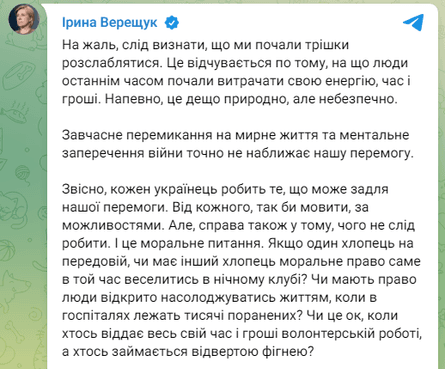 "К сожалению, следует признать, что мы начали немного расслабляться. Это чувствуется по тому, на что люди в последнее время начали тратить свою энергию, время и деньги. Наверное, это несколько естественно, но опасно", — написала Верещук.