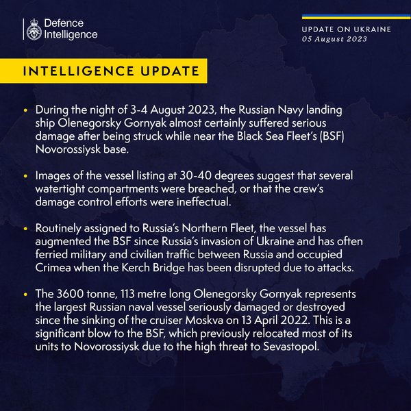 Российский десантный корабль "Оленегорский горняк" наверняка получил серьезные повреждения в результате атаки дронов возле базы Черноморского флота в Новороссийске. Об этом сообщила в Twitter британская военная разведка.