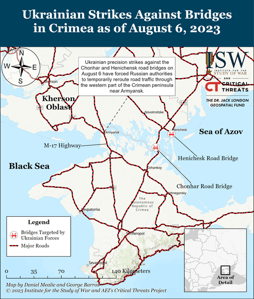 Украина 6 августа нанесла удары по двум ключевым автомобильным мостам, которые соединяют оккупированный Крым и оккупированную Херсонскую область, заставив ВС РФ перенаправить автомобильное движение с более коротких восточных маршрутов на более длинные западные. ВСУ методично пытаются отрезать ВС РФ на юге Украины и нарушить их материально-техническое обеспечение. Об этом говорится в аналитическом отчете американского Института изучения войны за 6 августа.