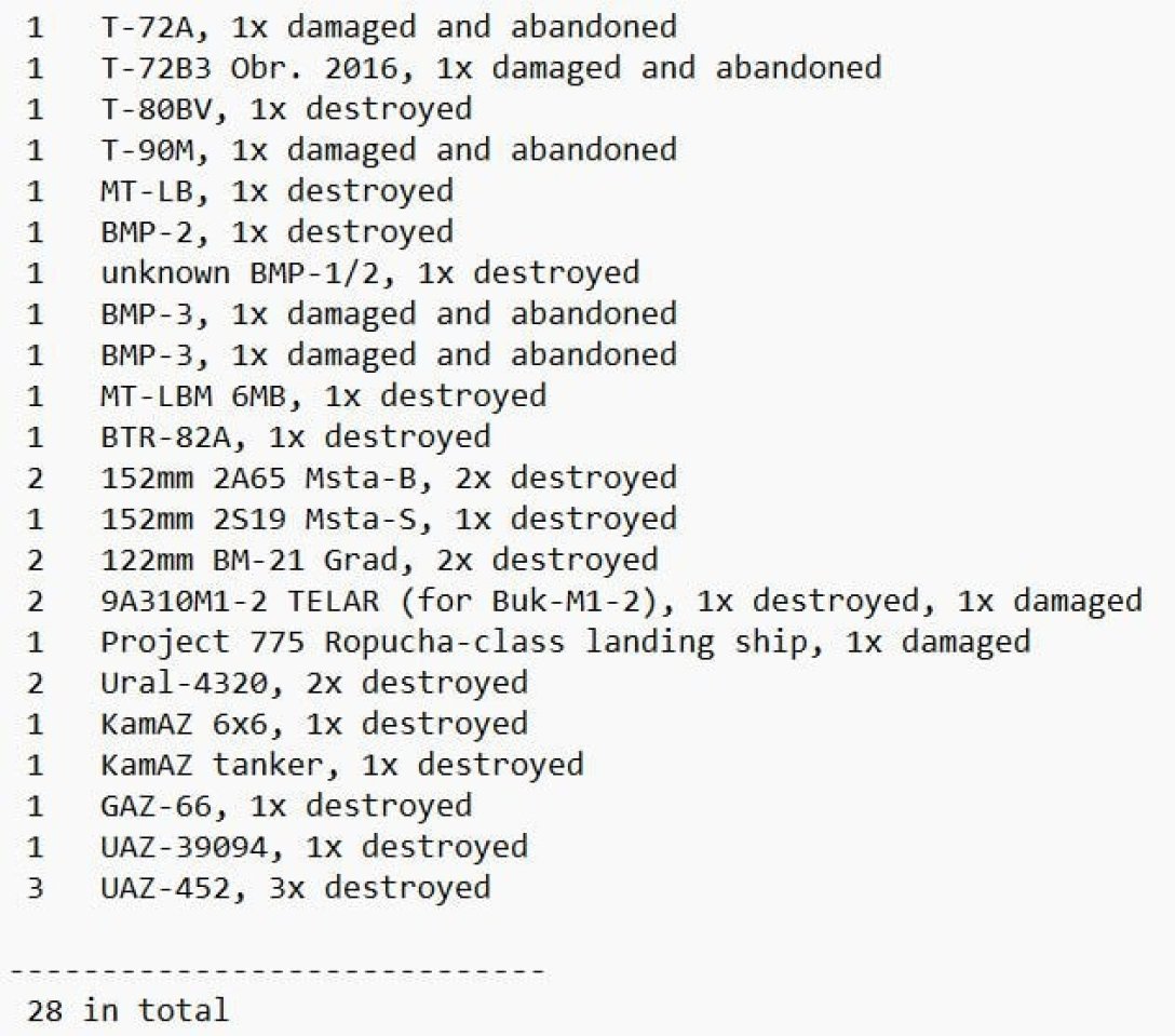 В обновленном списке потерь российские войска продолжают терять танки, артиллерию, транспортные машины и зенитно-ракетные комплексы. Однако стоит отметить, что в обновленный список попадут все визуально подтвержденные потери, поэтому они могут быть как неточными по количеству, так и не новые.
