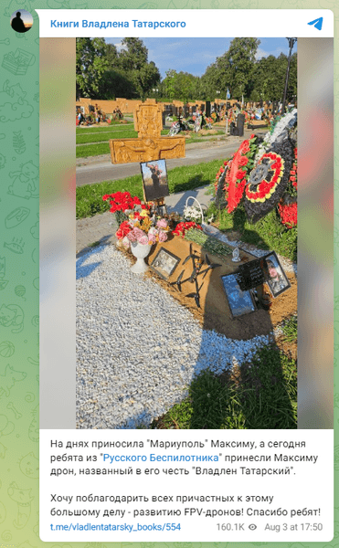 В телеграм-канале "Книги Владлена Татарского" ранее сообщили, что на могилу пропагандиста действительно положили дрон, но это был дрон, названный в его честь.