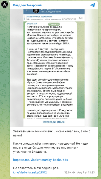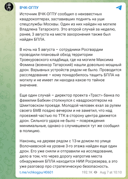 Зато в телеграмм-канале, посвященном пропагандисту Владлену Татарскому, информацию о "таинственных" дронах на кладбище опровергают.
