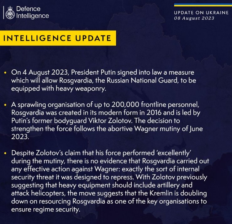 В британском Минобороны полагают, что Кремль намеревается укрепить Росгвардию тяжелым вооружением, чтобы обеспечит безопасность путинского режима от внутренних угроз, таких как военный мятеж ЧВК "Вагнер".