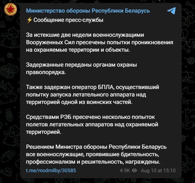 Как сообщили в Минобороны РБ, некие лица запускали БПЛА над охраняемыми объектами страны, в том числе над воинской частью.