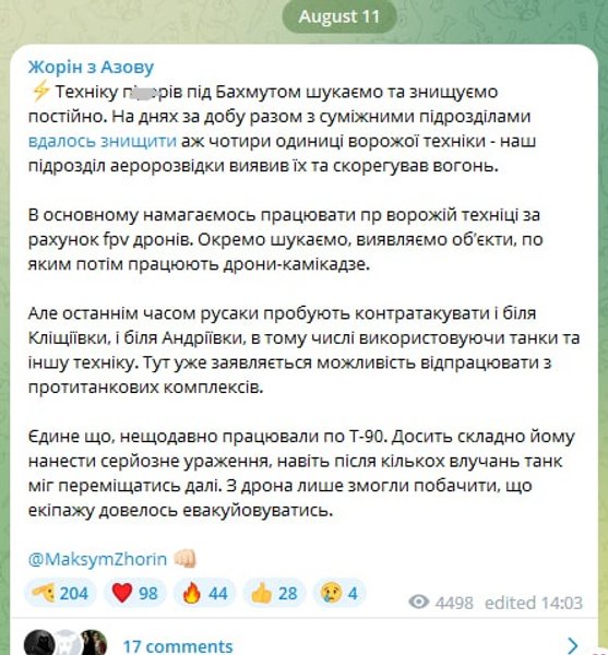 "В последнее время оккупанты пробуют контратаковать и возле Клещиевки, и возле Андреевки, в частности, используя танки и другую технику. Здесь уже заявляется возможность отработать из противотанковых комплексов. Единственное что, недавно работали по Т-90. Достаточно сложно ему нанести серьезное поражение, даже после нескольких попаданий танк мог перемещаться дальше. С дрона только смогли увидеть, что экипажу пришлось эвакуироваться", — отметил Максим Жорин.
