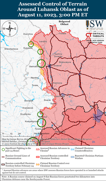 ВС РФ 11 августа продолжали наступательные действия к северо-востоку от Купянска и, по их сообщениям, имеют там продвижение. Генштаб Украины сообщил, что россияне вели неудачные наступательные действия вблизи Синьковки и Ивановки. Российское МО утверждало, что ВС РФ улучшили свое тактическое положение на Купянском направлении вблизи Ольшан и Першотравневого. Российские военные блогеры сообщали, что ВС РФ продвинулись вблизи Синьковки и Ивановки и вошли на северную окраину Синьковки.