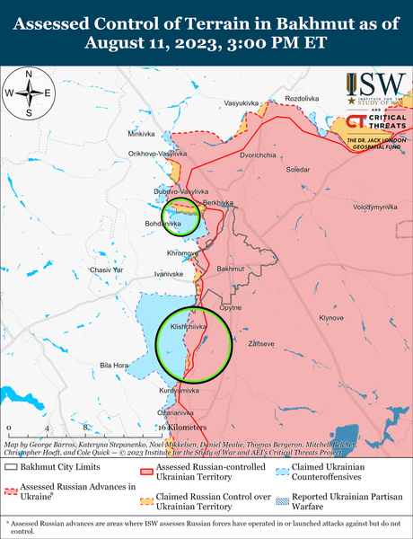 ВСУ вели наступательные действия вблизи Бахмута, но не продвинулись 11 августа. Российские блогеры утверждали, что украинские войска пытались прорвать российскую оборону возле Клещиевки.