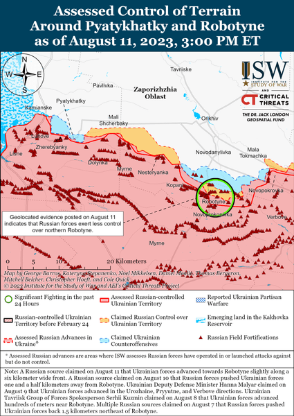 По информации аналитиков, Силы обороны достигли северной окраины Работино в Запорожской области. На опубликованных 11 августа геолокационных кадрах видно, что ВСУ дошли до подъезда к Работино, хотя масштабы их позиции в районе остаются неясными. Российский военный блогер утверждал, что российские силы отбросили украинские войска на 1,5 километра возле Работино во время отражения украинской атаки 10 августа.