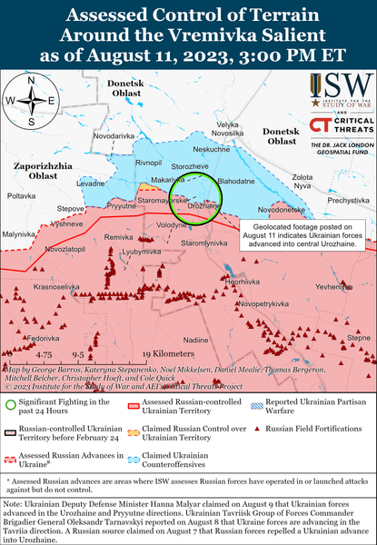 ВС РФ продолжали проводить ограниченные наступательные операции в районе границы Донецко-Запорожской области и не предпринимали никаких заявленных или подтвержденных наступлений 11 августа. Генштаб Украины сообщил, что российские войска предпринимали неудачные попытки отбить утраченные позиции к западу от Старомайорского и возле Урожайного.