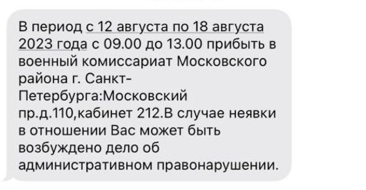 "Молодого человека приглашают прибыть в военкомат с 12 по 18 августа. "В случае неявки в отношении Вас может быть возбуждено дело об административном правонарушении", — говорится в сообщении.