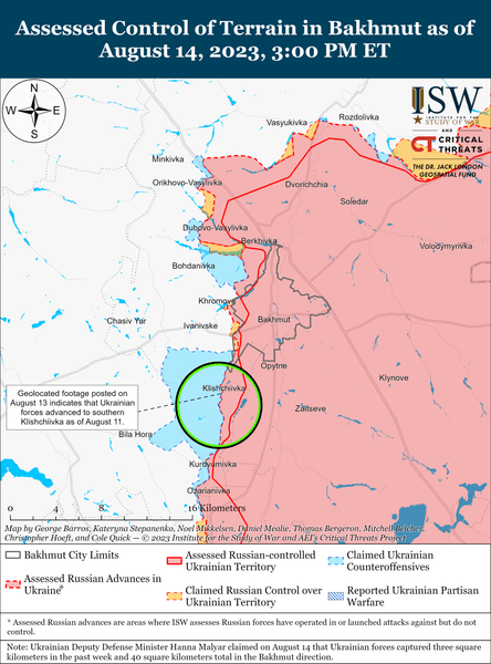 ВС РФ также продолжали наступательные операции вблизи Бахмута. По сообщению российских блогеров, ВС РФ якобы отбили утраченные позиции в Клещиевке во время контратаки и отбили весь населенный пункт. Однако ISW не нашло визуального подтверждения этих заявлений. Украинские официальные лица сообщили, что россияне предпринимали неудачные попытки отбить утраченные позиции возле Клещиевки, к западу от Андреевки и возле Курдюмовки.