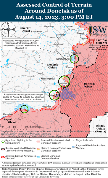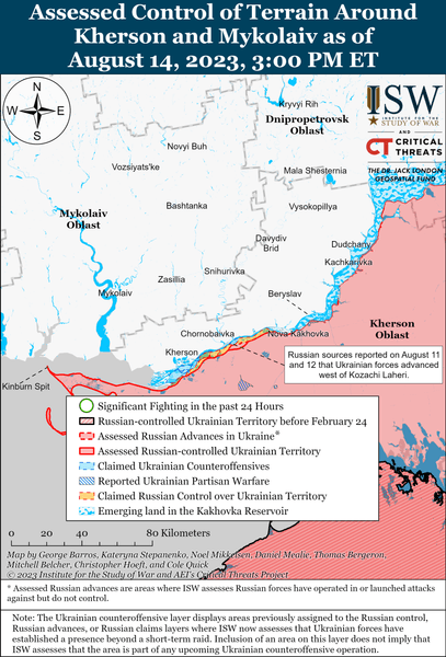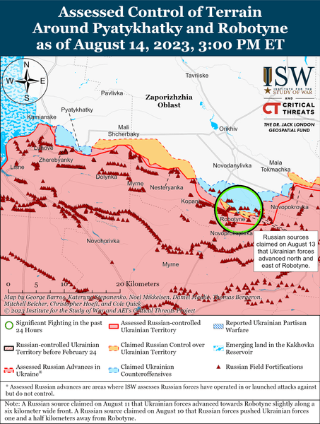 ВС РФ осуществили ограниченные наземные атаки в западной Запорожской области 14 августа и недавно заявили о наступлении. Генштаб Украины сообщил, что россияне безуспешно пытались восстановить утраченные позиции к востоку от Работино.