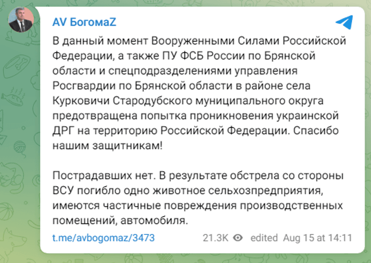 Глава Брянской области России Александр Богомаз заявил о предотвращении попытки проникновения в регион диверсионно-разведывательной группы из Украины. Об этом он 15 августа сообщил в своем Telegram-канале.