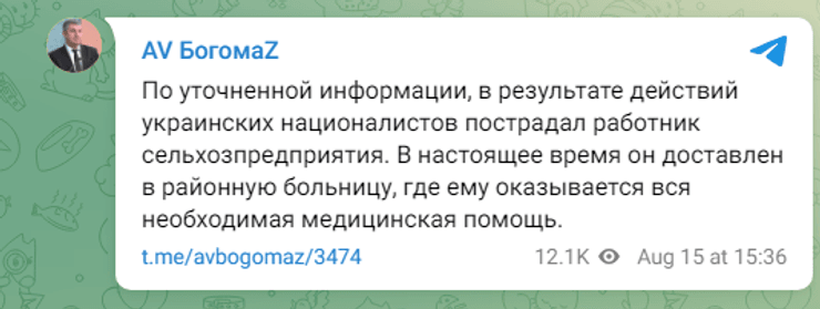 "По уточненной информации, в результате действий "украинских националистов" пострадал работник сельхозпредприятия. В настоящее время он доставлен в районную больницу, где ему оказывается вся необходимая медицинская помощь", — сообщил Богомаз.