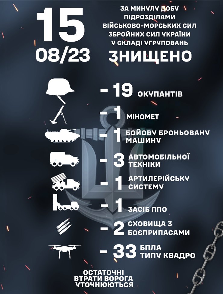 В командовании военно-морских сил (ВМС) ВСУ отчитались об успехах на фронте за сутки 14 августа. Об этом сообщила пресс-служба ВМС ВСУ.