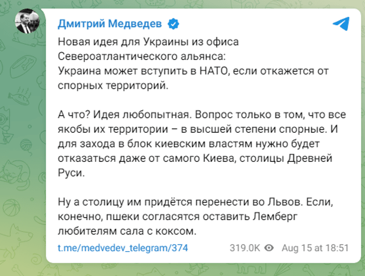 Заместитель председателя Совета безопасности РФ Дмитрий Медведев прокомментировал слова главы канцелярии генсека НАТО Стиана Йенссена о том, что Украина может стать полноценным членом Североатлантического Альянса, если откажется от части территорий в пользу России. Об этом Медведев написал в своем Telegram-канале 15 августа.