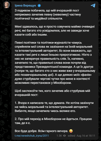 "Их, наверное, задело то, что правильные слова они услышали от представителя президентской команды. А это их раздражает (несмотря на то, что многие из них живут уже во вчерашнем или позавчерашнем дне). А еще некоторых моих "фанов" очень обеспокоили очередные слухи обо мне в контексте возможных перестановок в Минобороны", — говорится в сообщении Верещук.