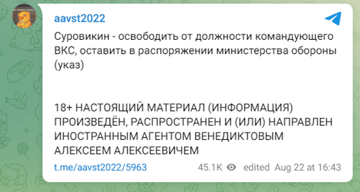 Стоит также отметить, что вслед за предполагаемым арестом Суровикина из российской армии уволили командующего ВКС РФ генерал-полковника Андрея Юдина.