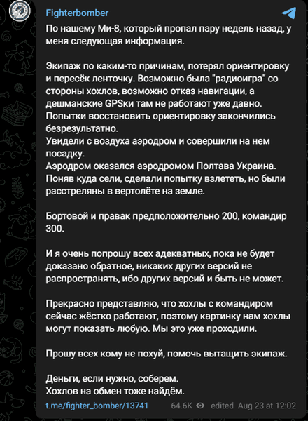 Несколько недель назад в Полтаве якобы по ошибке совершил посадку вертолет Вооруженных сил Росси Ми-8 на аэродроме Полтава, а его экипаж был расстрелян. Об этом 23 августа сообщил капитан ВС РФ Илья Туманов в своем Telegram-канале Fightbomber.