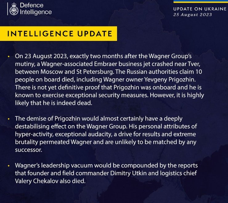 Британская разведка отмечает, что по данным российских властей, 23 августа спустя два месяца после мятежа "вагнеровцев" под Тверью разбился самолет, в котором находился владелец компании "Вагнер" Евгений Пригожин. Погибли 10 человек.