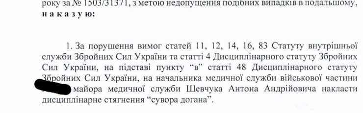 "За нарушения требований статей 11, 12, 14, 16, 83 Устава внутренней службы Вооруженных сил Украины и статьи 4 Дисциплинарного устава Вооруженных сил Украины, на основании пункта "в" статьи 48 Дисциплинарного устава Вооруженных сил Украины, на начальника медицинской службы воинской части (номер не указан, — прим. ред) майора медицинской службы Шевчука Антона Андреевича наложить дисциплинарное взыскание "строгий выговор", — говорится в тексте документа.