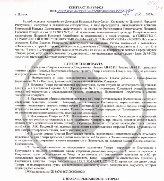 "27 июля уже упомянутая нами "Фирма Монблан" заключила сделку еще на 73 тысячи рублей. За эти деньги компания продает топливо так называемому казначейству так называемой "днр". Схема такая, как и в предыдущих контрактах: продают талоны, которые можно использовать на заправках "Монблана", — пишет Bihus.Info.