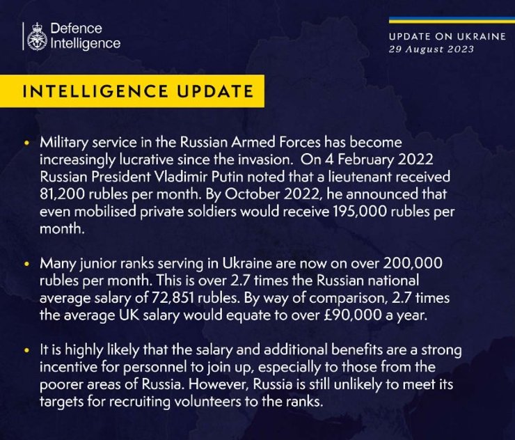 Британская разведка отмечает, что 25 августа 2023 года двое российских военнослужащих были приговорены военным судом к отбыванию не менее двух лет в колонии за отказ подчиниться приказу о возвращении на фронт в Украину. В целом если в дальнейшем процент отказников сохраниться, то за год в РФ будут вынесены свыше 5 000 приговоров за отказ от участия в боевых действиях.