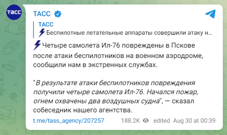 Представитель Главного управления разведки Министерства обороны Украины (ГУР) Андрей Юсов заявил, что четыре военно-транспортных самолета Ил-76 были уничтожены на аэродроме в российском Пскове. Об этом он 30 августа заявил в комментарии для LIGA.net