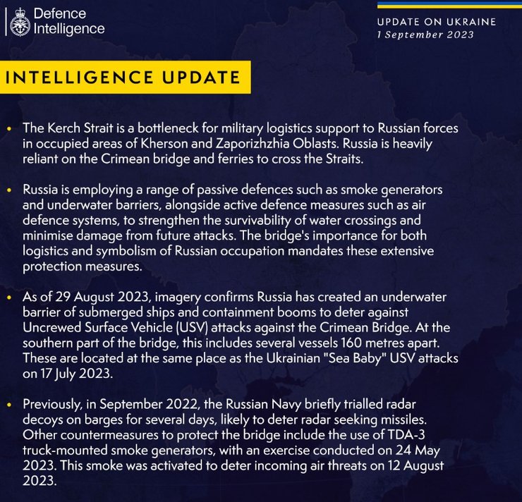 Керченский пролив является узким местом для военно-логистического обеспечения российских войск. Чтобы повысить безопасность водных переправ, и прежде всего Керченского моста, Россия применяет ряд пассивных средств защиты, а также активные меры обороны, такие как системы ПВО. Об этом 1 сентября сообщила пресс-служба Минобороны Великобритании.