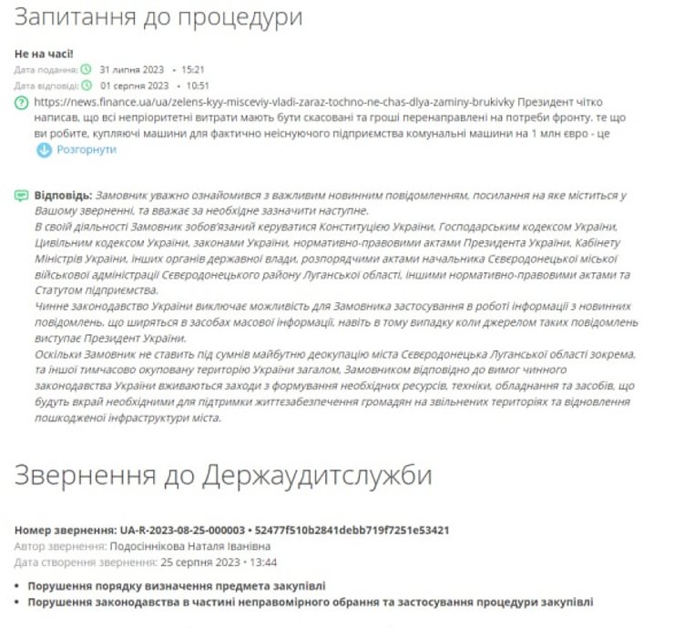 В свою очередь заказчик ответил, что по закону не может пользоваться в работе информацией из новостных сообщений, которые распространяют СМИ, даже если источником выступает президент Украины. Заказчик заявил, что делает закупки на будущее, когда Северодонецк будет освобожден от оккупации.