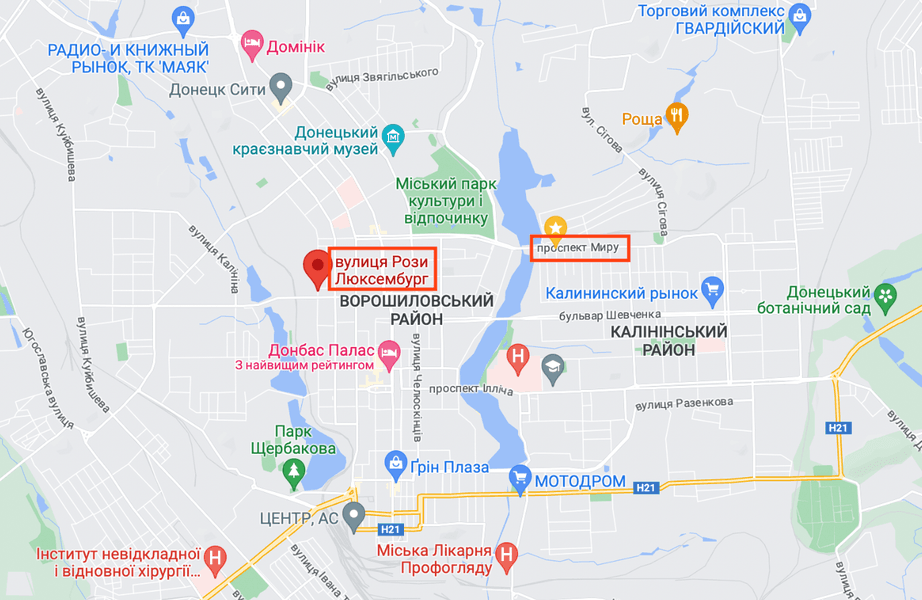 Стоит отметить, что "Измуруд" — это местный магазин, а в районе пострадавшего от обстрела проспекта Мира находится захваченное здание администрации Донецка. Кроме того, в районе улицы Розы Люксембург и упомянутого проспекта расположено бывшее здание СБУ.