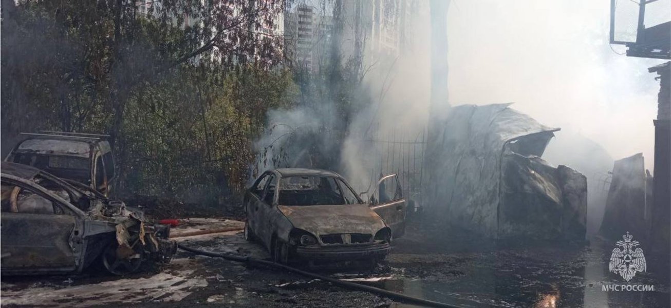 Пожарные рассказали детали ЧП: пылает 3 автомобиля, гараж и сарай. Общая площадь возгорания — до 80 кв. м. В российских пабликах указывают, что возможное место возгорания — здание российской Государственной инспекции безопасности дорожного движения (ГИБДД).