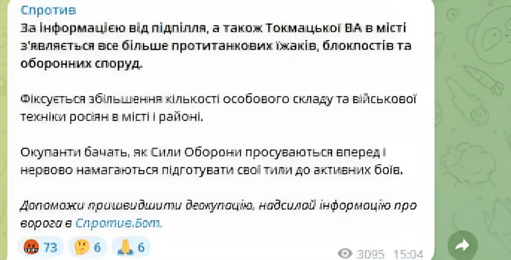 Так, местное подполье и законная Токмакская ВА передает, что в городе появляется все больше противотанковых ежей, блокпостов и оборонительных сооружений. Также фиксируется увеличение количества личного состава ВС РФ и военной техники россиян в городе и районе.