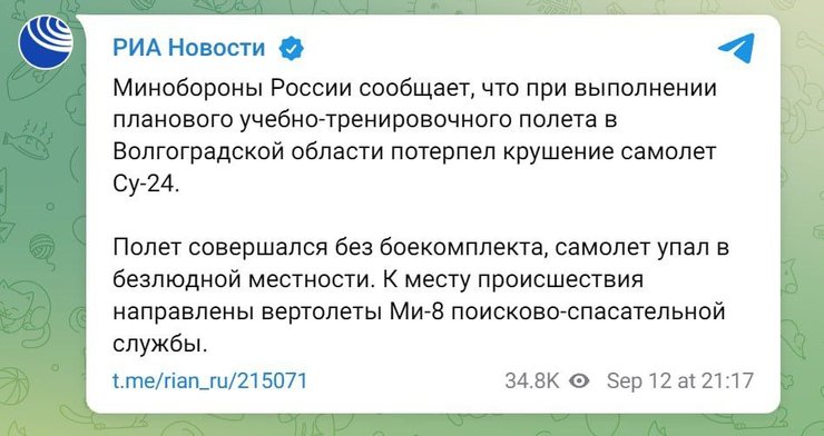 "Полет происходил без боекомплекта, самолет упал в безлюдной местности. К месту происшествия направлены вертолеты Ми-8 поисково-спасательной службы. Су-24 совершал полет без боекомплекта, самолет упал в безлюдной местности в Волгоградской области", — говорится в сообщении.