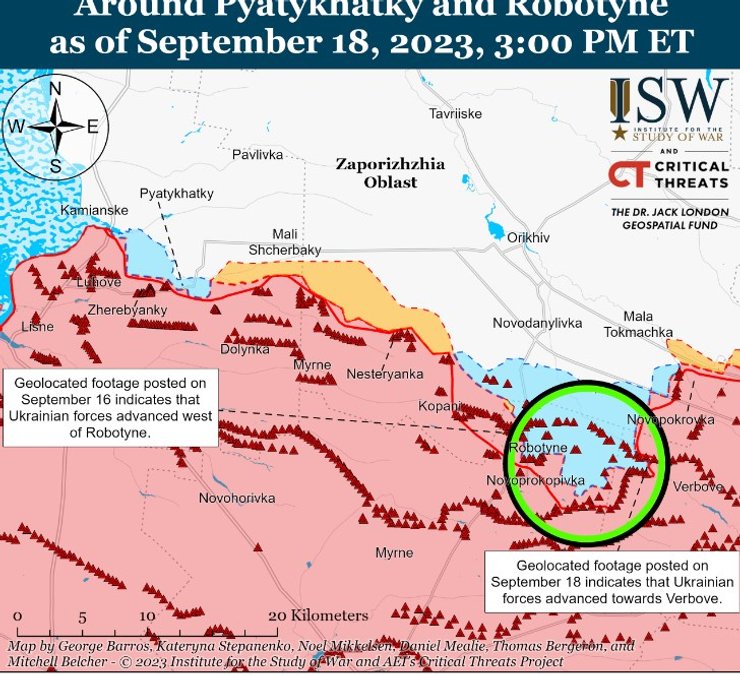 Американские аналитики обратили внимание на слова бывшего заместителя министра обороны Украины Анны Маляр о том, что в течение прошлой недели украинские силы освободили 5,2 квадратных километров в южном направлении и достигли неопределенных успехов к югу от населенного пункта Роботино. В ВСУ подтвердили тщетные попытки российских войск атаковать и вблизи Новоданиловки. Российский "военкор" утверждал, что оккупанты решили реализовать контратаку к западу от Вербового, но не уточнил результат.