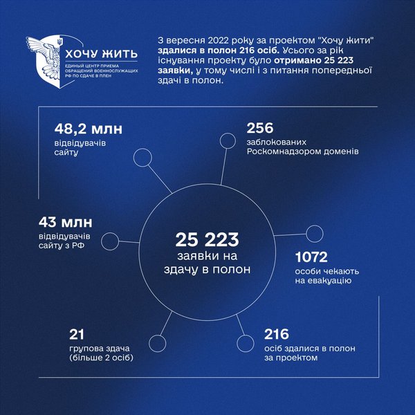 Российские спецслужбы всячески блокируют доступ к доменам проекта "Хочу жить". В течение одного года "Роскомнадзор" заблокировал 256 таких доменов. За это время было получено 25253 заявки на сдачу в плен, физически сдались 216 человек.