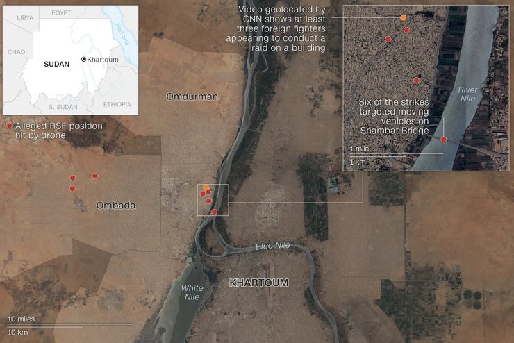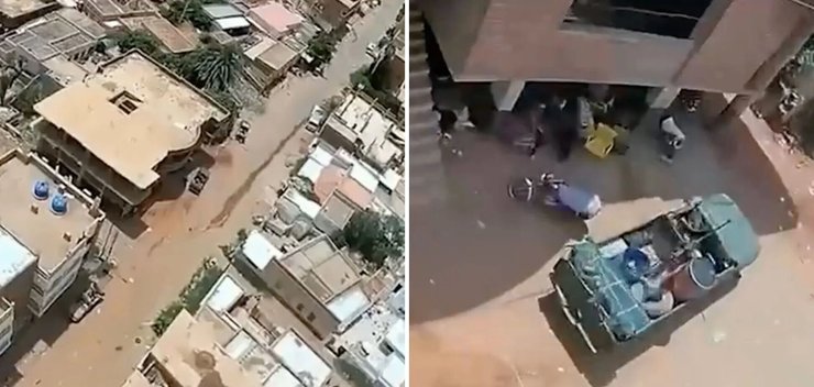 На обнародованных кадрах видно, что БпЛА поразили движущиеся и неподвижные машины боевиков. 6 ударов было нанесено по пикапам, которые двигались по мосту Шамбат. Еще 8 беспилотников атаковали припаркованные авто, здания и вооруженных людей в западном пригороде Омбада и Омдурмане.