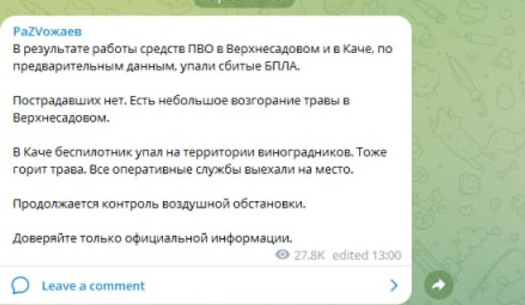 "Губернатор" Севастополя Михаил Развожаев сообщил, что Севастополь атакуют беспилотники. По его информации, в результате падения сбитых БпЛА в Верхнесадовом и Каче горит трава. По предварительным данным, пострадавших нет.