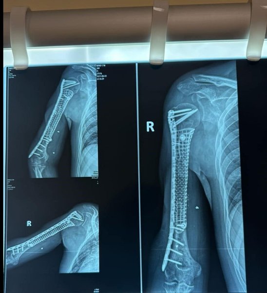 В сообщении вспомнили, как в больницу привезли морского пехотинца с тяжелым ранением плеча. У него не было части кости, вырван большой участок мышц, но сохранен сустав. Бойцу повезло, поскольку на предыдущих этапах лечения специалисты не ампутировали руку. Ранее врачи со спины переместили мышцы с кожей на плечо. Впоследствии хирургам удалось установить имплант. После операции воин через три месяца уже мог неплохо двигать рукой, что подтвердило эффективность применения такой методики.