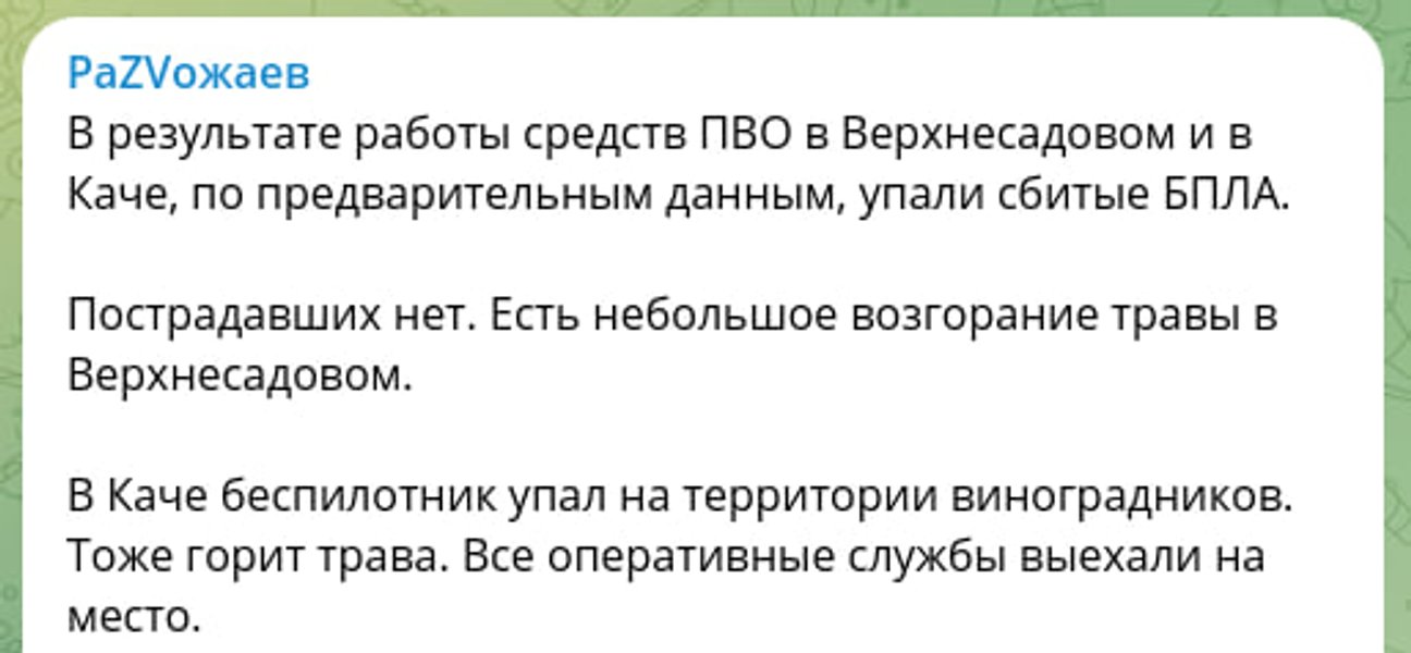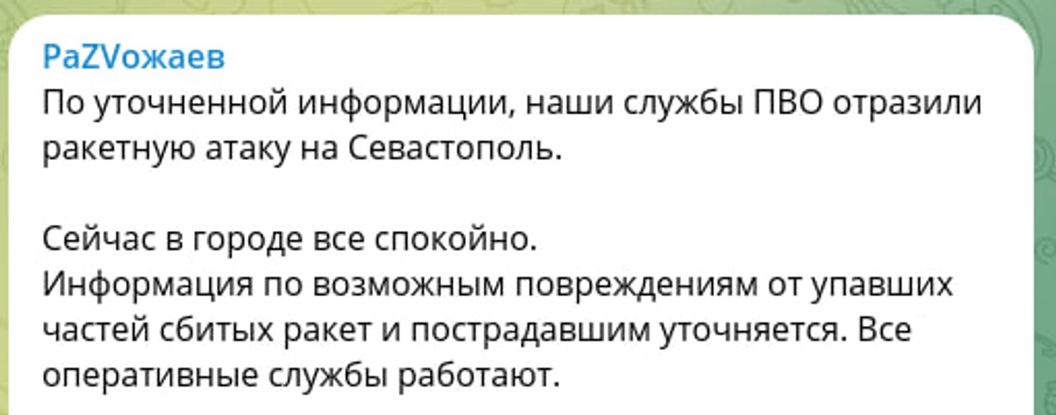 Представители российской власти заявили, что якобы состоялась ракетная атака. Доблестное ПВО России сбило все ракеты, уверяли оккупанты. Между тем в сети опубликовали кадры, на которых видно дым в направлении села Верхнесадового. Кроме того, стало известно об исчезновении электроэнергии на мысе Фиолент (южнее Севастополя), перекрытии рейда в бухте и о скорой помощи, которая направлялась к месту задымления.