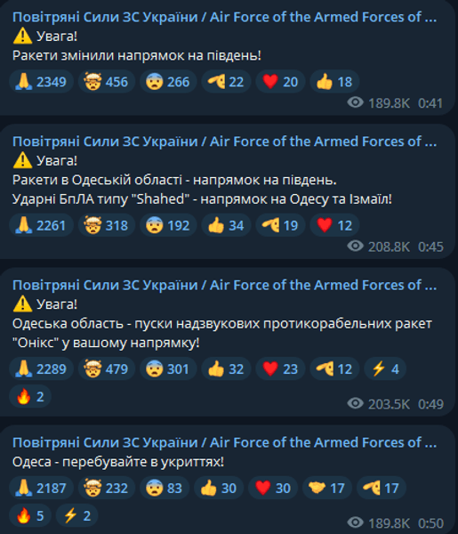 "Внимание! Одесская область — пуски сверхзвуковых противокорабельных ракет "Оникс" в вашем направлении!" — предупредили в Воздушных силах.
