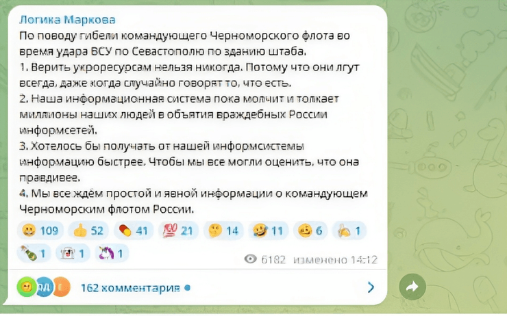 В России переживали, что Минобороны РФ, как всегда, скрывает правду от граждан, в том числе и о потерях в результате ракетной атаки Украины на штаб Черноморского флота России в Севастополе. Поэтому в сети начали требовать предъявить им живого или мертвого командующего Черноморского флота Виктора Соколова, о котором украинские СМИ сообщили, что он погиб. С таким требованием к российским властям в своем телеграм-канале обратился пропагандист Сергей Марков.