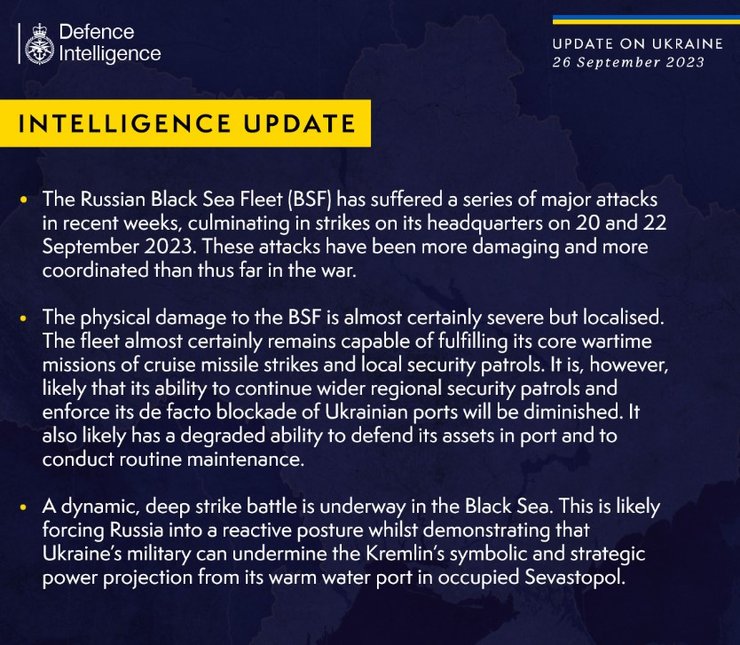 Удары украинских сил по кораблям и военной инфраструктуре Черноморского флота РФ были более разрушительными и лучше скоординированными, чем до сих пор в ходе войны. Это говорит о том, что в регионе идет динамичное противостояние, которое может существенно подорвать сильное стратегическое положение России. Об этом 26 сентября сообщила пресс-служба Минобороны Великобритании.