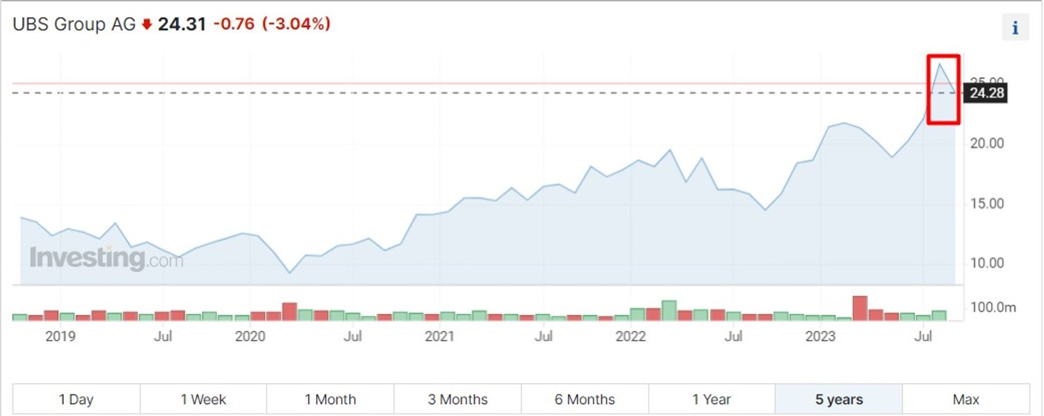 Отметим, на мониторинговых сайтах можно проследить, как менялась стоимость акций банковских групп Credit Suisse и UBS в течение последних пяти лет. В частности, в Credit Suisse особенно ощутимое падение произошло зимой 2022 года, но до того в основном наблюдался стабильный рост. Тогда как в UBS наблюдался рост до начала 2023 года, а затем стоимость акций то внезапно росла, то падала.