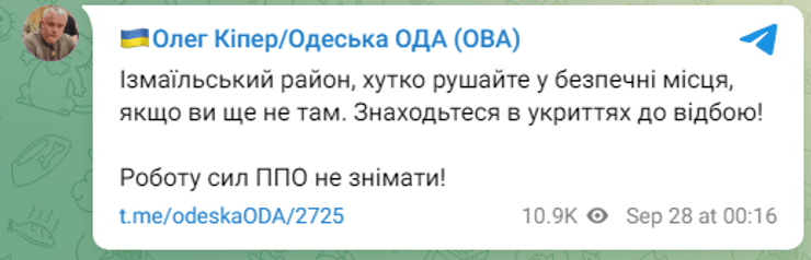 "Измаильский район, быстро отправляйтесь в безопасные места, если вы еще не там. Находитесь в укрытиях до отбоя!" — написал глава Одесской ОВА Олег Кипер в своем Telegram-канале.