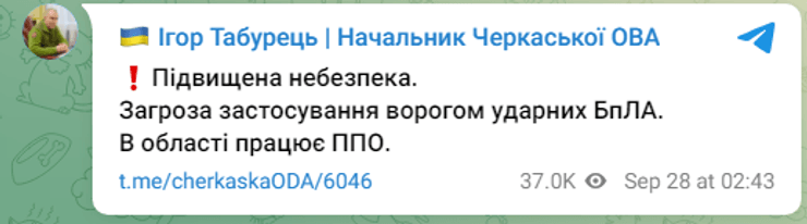 "Повышенная опасность. Угроза применения врагом ударных БПЛА. В области работает ПВО", — написал глава Черкасской ОВА Игорь Табурец.