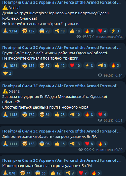 Сперва было объявлено о воздушной тревоге в связи с угрозой "Шахедов" в Кировоградской, Николаевской, Херсонской и Днепропетровской областях. В Запорожской области тревога была связана с активностью вражеской тактической авиации на юго-восточном направлении.